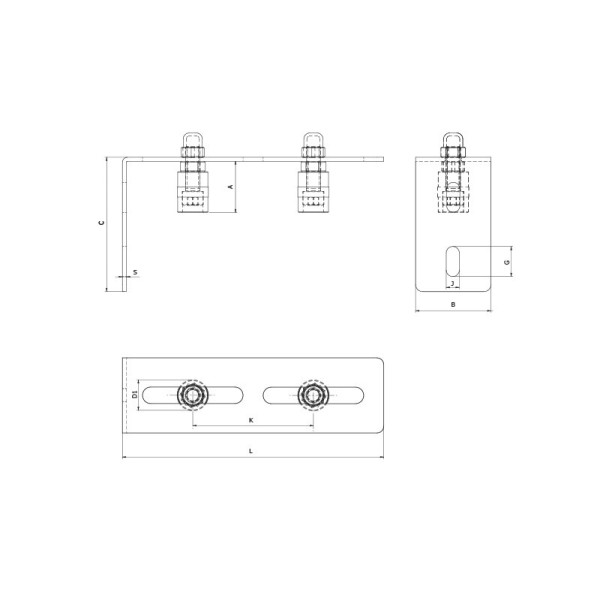 Konzole pozinkovaná se dvěma nastavitelnými vodícími rolnami pro horní vedení pojezdové brány o tloušťce 0 až 134mm. | NÁZEV | D1 | A | B | C | G | J | K | L | S | |