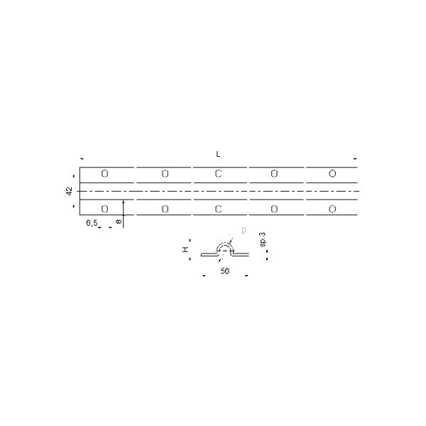 kolejnice pro přišroubování na beton, pro O kladky, 6m dlouhý profilKolejnice pro pojezdovou bránu, na přišroubování na beton, pro O kladky, D = 20mm, pozinkovaná (profil o délce 6m). | NÁZEV | L | Ø | H | Otvory | ||||