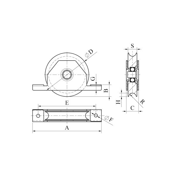 O kladka se dvěma ložisky a domkem, průměr kladky 100mmO kladka se dvěma ložisky a domkem, průměr kladky 100mm.NÁZEV | A | B | C | ØF | E | ØG | Sp | R | Ložisko | Kolejnice | Nosnost | ||||