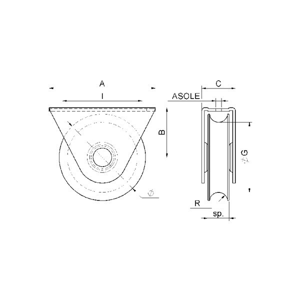 O kladka s jedním ložiskem a podvěsem, průměr kladky 80mmRozměry viz. obrázek. | NÁZEV | A | B | C | ØG | I | Asole | Sp | R | Ložisko | Kolejnice | Nosnost | |||||