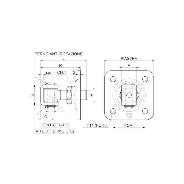 pant s přírubovou deskou pro přišroubování na zeď, M24, pozinkovanýPant s přírubovou deskou pro přišroubování na zeď, nastavitelný s regulovací maticí, M24, pozinkovaný.Rozměry viz. obrázek.NÁZEV | A | B | C | ØD | L | Sp | M | R | CH.1 | CH.2 | Fori | Deska | |||||