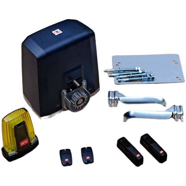 elektronickou regulací otáček a ochranou proti sevření, vestavěnou ústřednu s přijímačem dálkových ovladačů2× MITTO B2 dálkový ovladač1× COMPACTA A20-180 bezpečnostní fotobuňky s možností otočení až o 180°1× RADIUS 24V maják s anténouNízkovoltážní pohon 230V/24V pro posuvnou bránu o hmotnosti do 400kg.