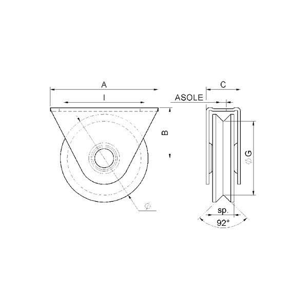 V kladka s jedním ložiskem a podvěsem, průměr kladky 60mmV kladka s jedním ložiskem a podvěsem, průměr kladky 60mm.Rozměry viz. obrázek.| NÁZEV | A | B | C | ØG | I | Asole | Sp | Ložisko | Kolejnice | Nosnost | ||||