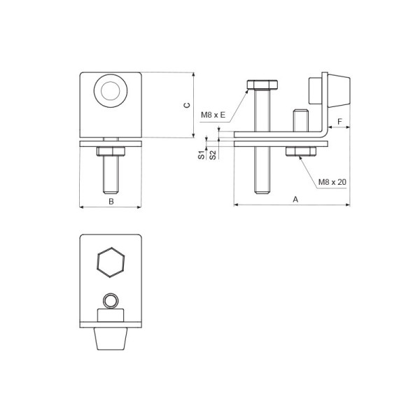 vnitřní doraz do malé i střední kolejnice pro zavěšenou bránuVnitřní pozinkovaný doraz do malé i střední kolejnice (C profilu) pro zavěšenou bránu.Lze použít pro malý i pro střední C profil zavěšené brány. | NÁZEV | A | B | C | E | F | S1 | S2 | Pro kolejnici | ||