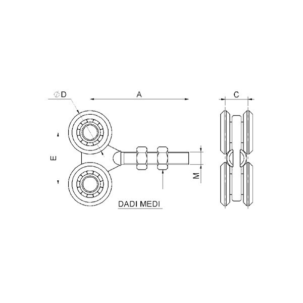 Malý závěsný vozík se čtyřmi ložiskovými rolnami a závitovým závěsem, nosnost do 50kg, pro závěsnou kolejnici HH CP.NÁZEV | A | C | ØD | E | M | Nosnost | Pro kolejnici | ||||